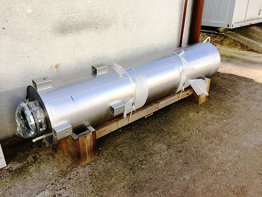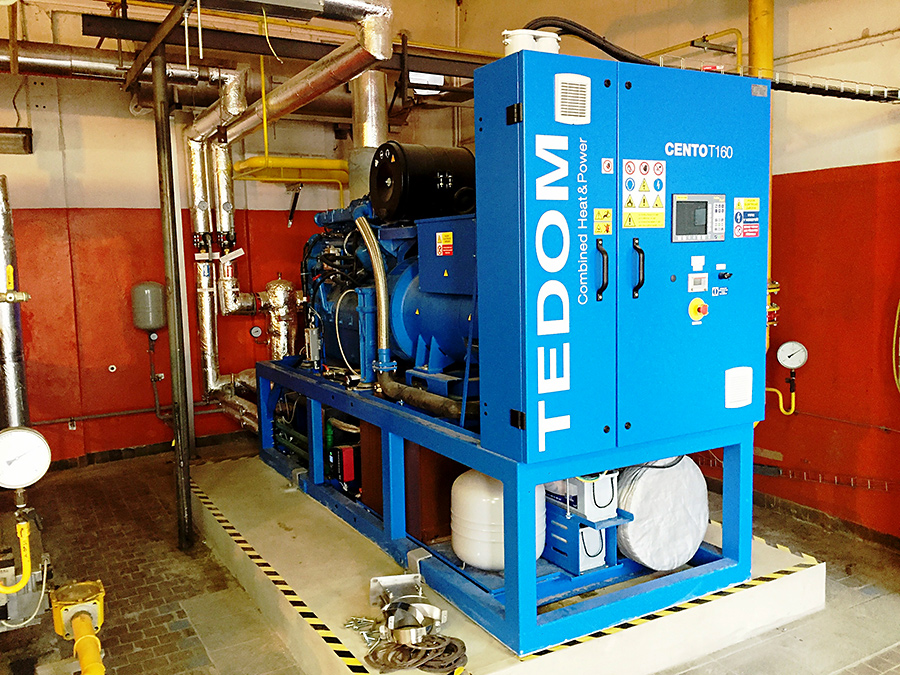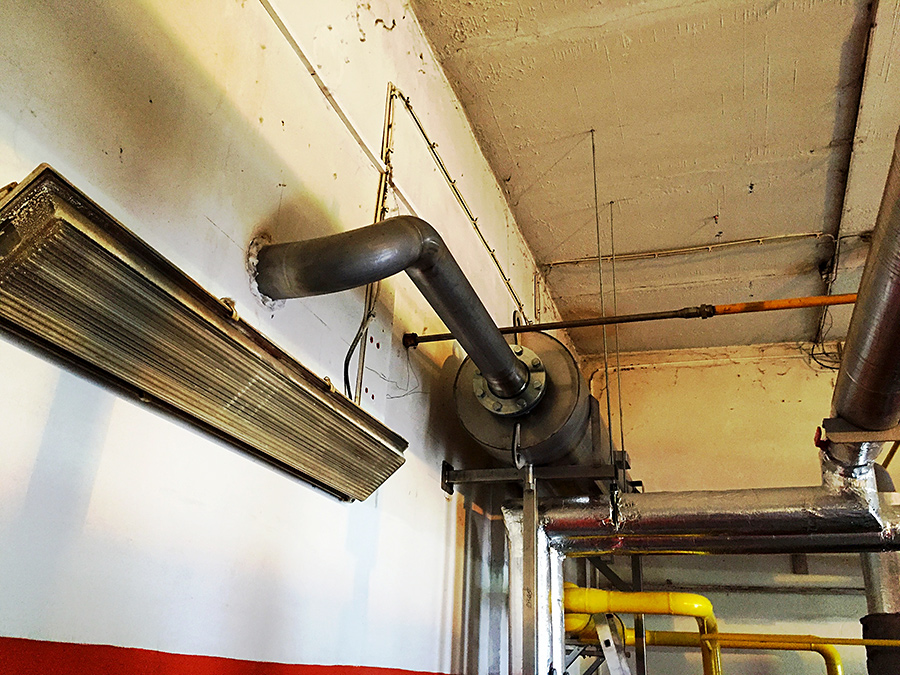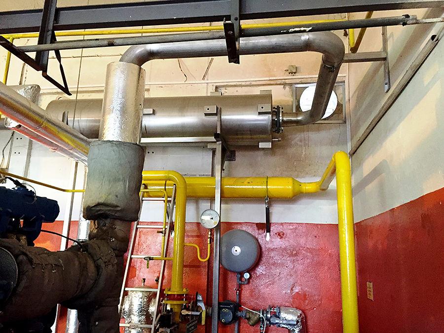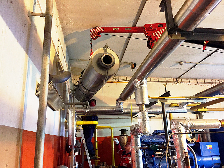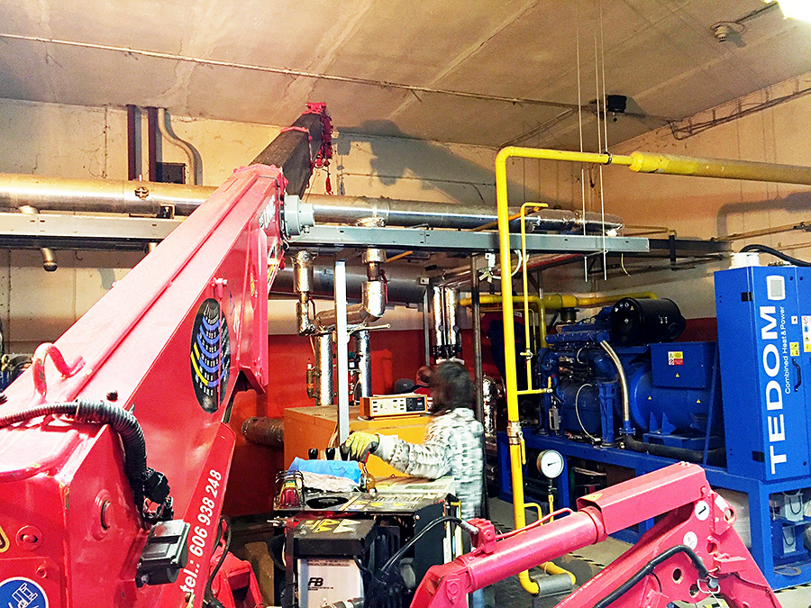 Montáž tlumiče kogenerační jednotky ve stísněných prostorech za pomocí mini jeřábu UNIC 295, výroba a montáž konzolí pro uložení tlumiče, usazení tlumiče a následné propojení tlumiče kogenerační jednotky nerezovým potrubím DN125 a napojení na stávající kouřovod.