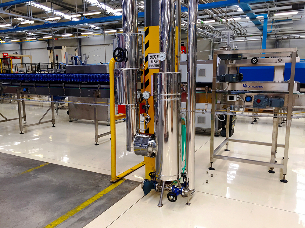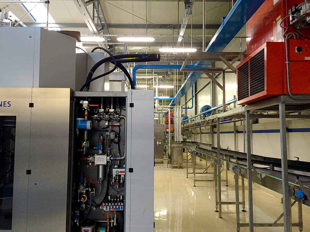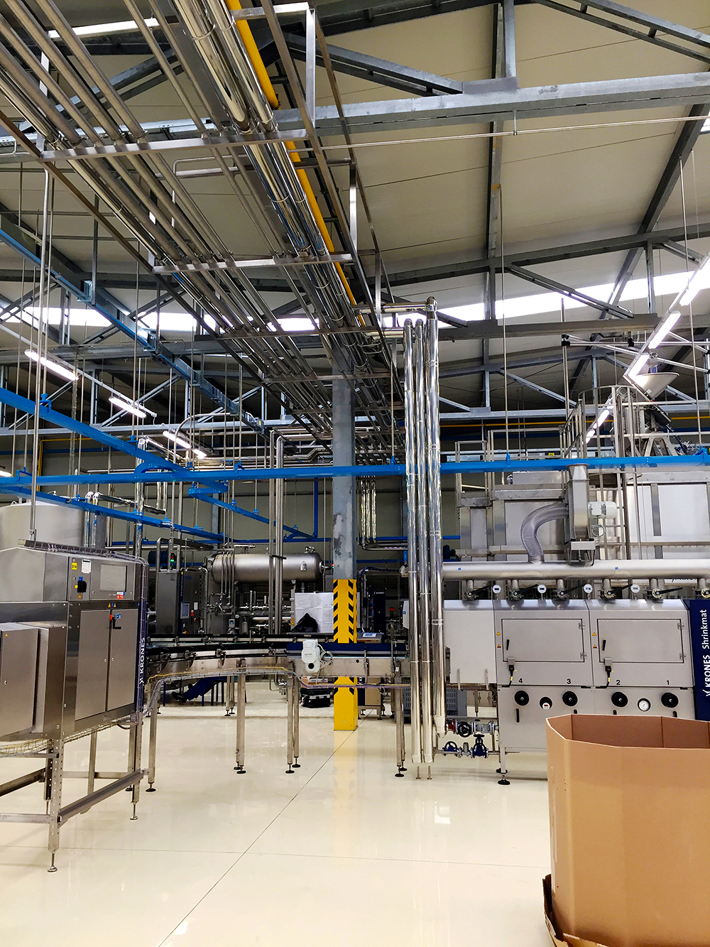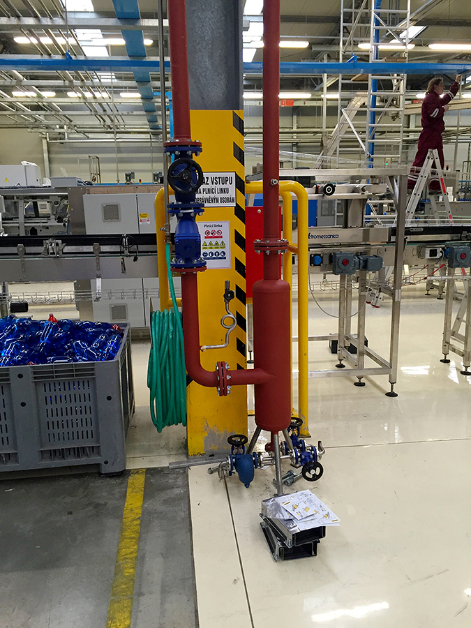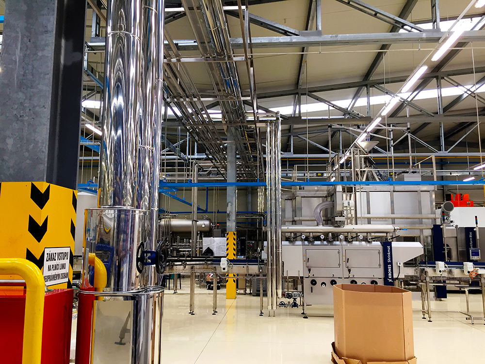 Připojení výrobní linky PET II na technologické rozvody, výroba nerezové kondenzační nádrže, výroba parního separátoru, montáž potrubních rozvodů na páru a kondenzát včetně izolací DN25 – DN80, připojení vyfukovačky KRONES na vzduch 40bar DN50 – DN125, připojení vyfukovačky KRONES na chladící okruh DN50, připojení CIP DN40 – DN80, připojení SHRINKMATU DN20 – DN40.