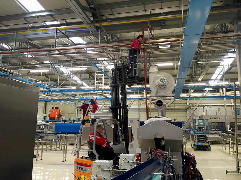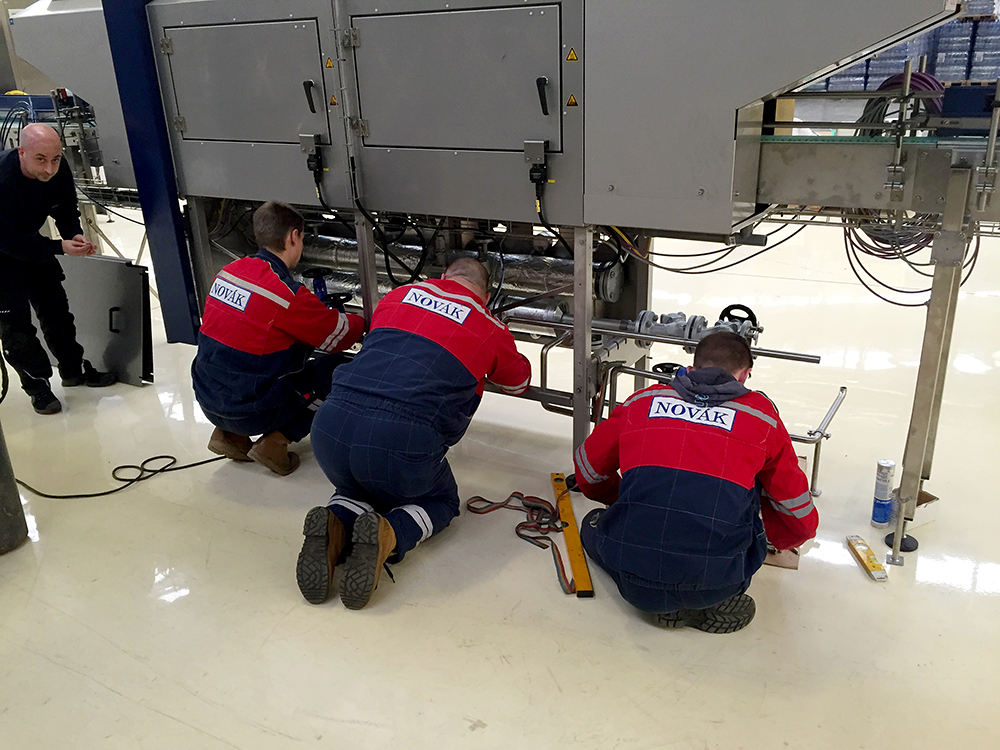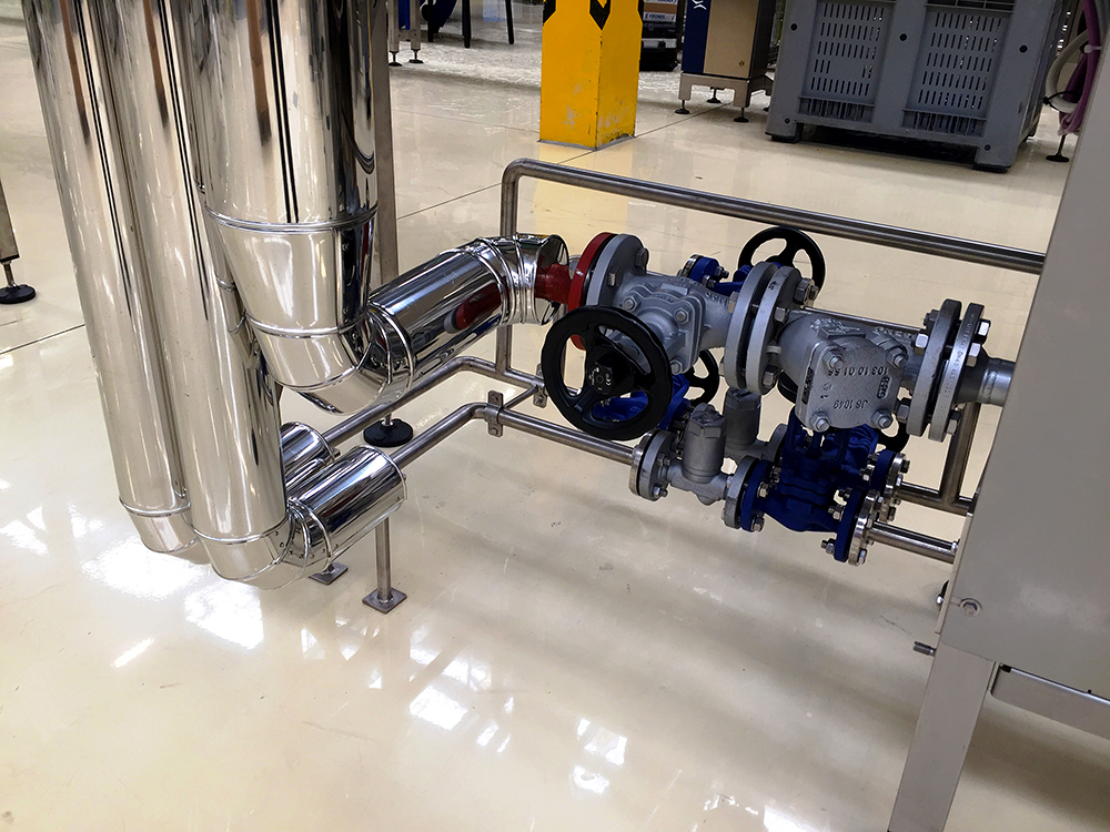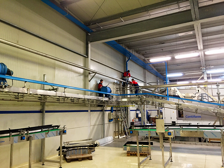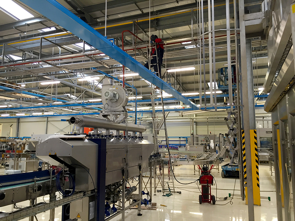 Připojení výrobní linky PET II na technologické rozvody, výroba nerezové kondenzační nádrže, výroba parního separátoru, montáž potrubních rozvodů na páru a kondenzát včetně izolací DN25 – DN80, připojení vyfukovačky KRONES na vzduch 40bar DN50 – DN125, připojení vyfukovačky KRONES na chladící okruh DN50, připojení CIP DN40 – DN80, připojení SHRINKMATU DN20 – DN40.