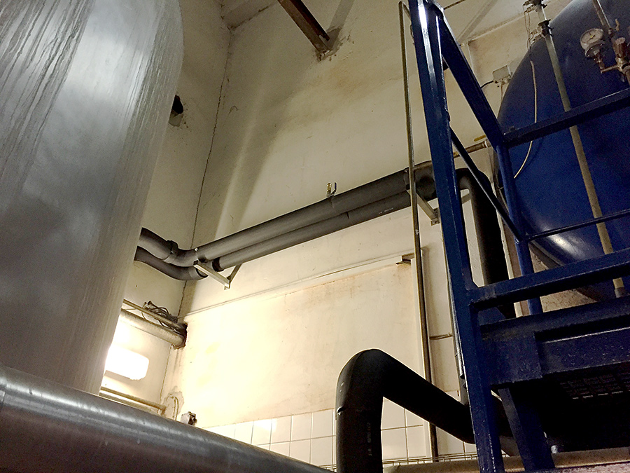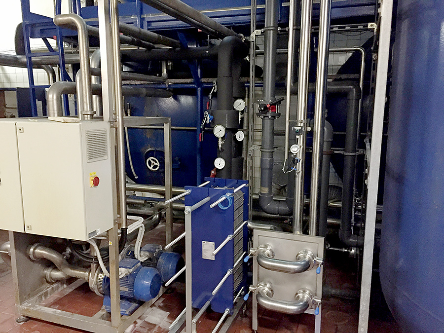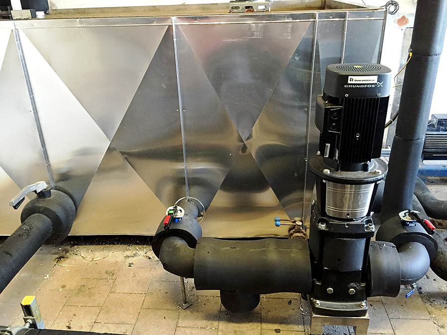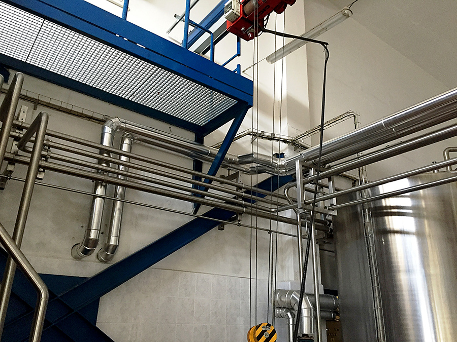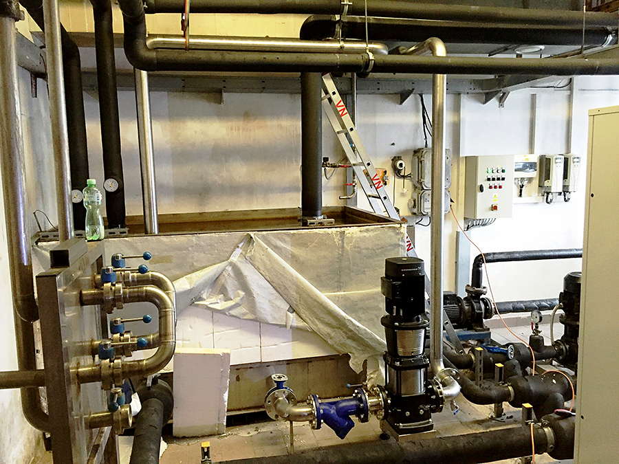 Montáž nerezových potrubních rozvodů DN80 na chlazení produktové vody včetně izolací, výroba nerezových rozdělovacích panelů, výroba nerezového rámu pod výměník tepla a čerpadlo, propojení nových nerezových potrubních rozvodů na stávající technologii.
