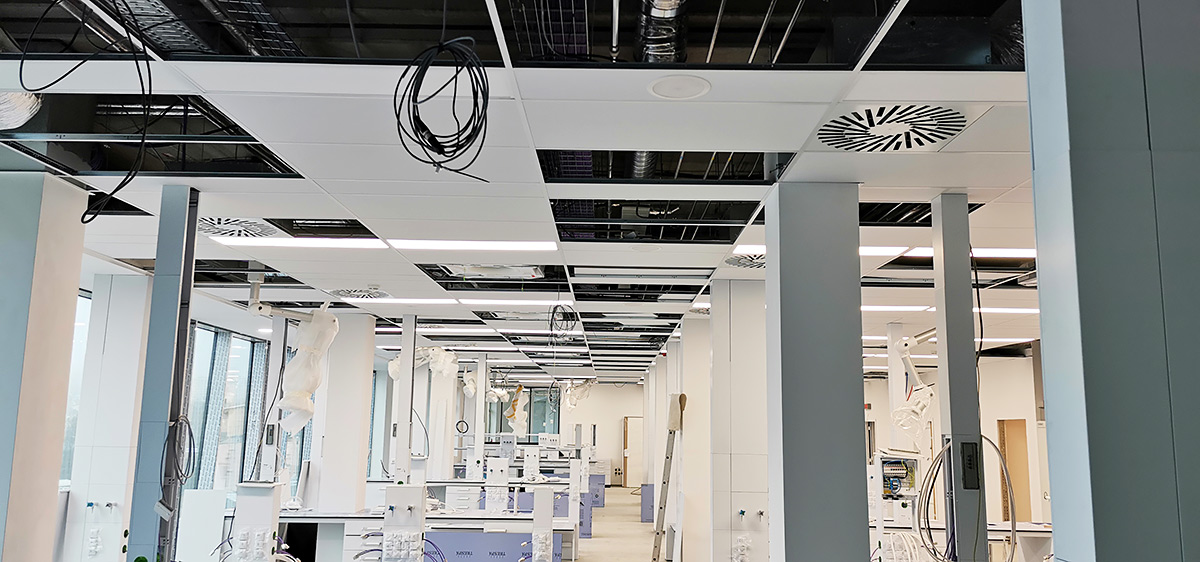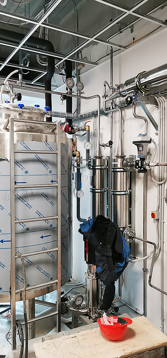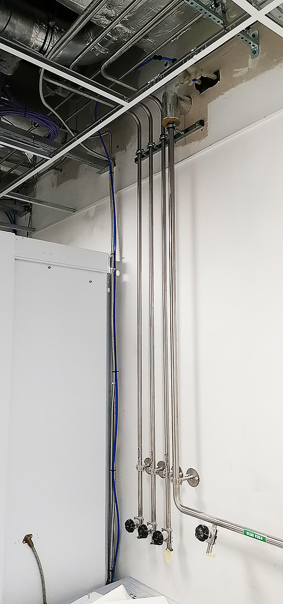 Montáž nerezových potrubních rozvodů technických a speciálních plynů, demi vody, napojení laboratorních stolů na odpadní potrubí.